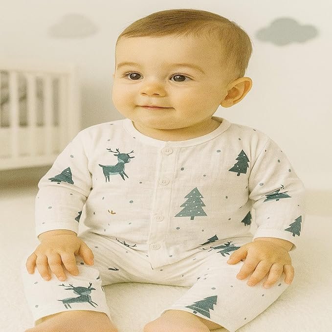 Wrap your little one in comfort with BebyBaby’s delightful muslin cotton night suit set. This charming sleepwear ensemble features a full-sleeves shirt paired with cosy pajamas, adorned with adorable prints that your child will love. Crafted from premium muslin cotton, the fabric ensures maximum breathability and softness against your baby’s delicate skin. The night suit set is thoughtfully designed for both boys and girls, making it a versatile addition to your infant’s wardrobe. The relaxed fit allows unrestricted movement during sleep or playtime, while the full-sleeves design provides just the right amount of warmth. Perfect for newborns and infants, this night suit set combines style with practicality. The easy-to-wear design makes bedtime routines smoother, and the high-quality stitching ensures the garment maintains its shape and comfort through multiple washes. Give your child the gift of peaceful sleep with this soft and breathable sleepwear set.